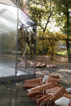 | 13.10. - 10.11.2007 Nicole Schuck Anne Katrin Stork In der gemeinschaftlichen Ausstellung haben die Künstlerinnen eine begehbare Welt geschaffen, die sich mit Fragen nach unseren Lebensbedingungen auseinandersetzt. Beide Arbeiten beziehen sich unmittelbar aufeinander, speisen sich aus verschiedenen Sicht- und Herangehensweisen und ergänzen sich in ihrer Beschreibung und Übersetzung von Wirklichkeit. Zu