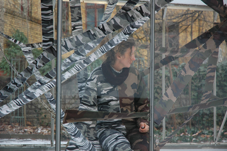 Kathrin Rabenort | Private Boundary Opening on Sunday, 15.01.2017, 4pm Artist Talk on Wednesday, the 18.01.2017, 7 pm Von Januar - März 2017 zeigt Kathrin Rabenort zeitgleich zur fashion week, Berlin ihre speziell für super bien! entwickelte skulpturale Rauminstallation, gefertigt aus militärischen Tarnstoffen. Das Gewächshaus ist in seiner Struktur auf Lichtdurchlässigkeit angelegt und 24 Stunden für Besucher einsehbar. Mit "Privat Boundary" kehrt Rabenort diese architektonisch offene Situation um und stellt dabei Fragen zu Kontrolle und Überwachung in privaten und öffentlichen Bereichen. Aus verschiedenen Camouflagestoffen knüpft Rabenort eine Netzstruktur, die den kompletten Innenraum durchzieht. Sie verweist dabei auf die Ambivalenz der Chancen digitaler Vernetzung und den Möglichkeiten und Gefahren der Kontrolle durch Andere, die die Menschen ganz privat betrifft. Ihre Arbeit verweist auf die globale Tendenz, Ländergrenzen wieder zu schliessen, statt sie zu öffnen, auch hier in Europa. Sie benutzt dabei die Assoziation der Camouflage-Stoffe zum Militär, dessen Rolle in der Grenzsicherung zentral ist. Beeinflusst ist Rabenort dabei nicht zuletzt von ihre aktuelle Artist in Residence Erfahrung in China, Shanghai. Zu Ihrer stofflichen Installation näht Kathrin Rabenort aus den verschiedenen Camouflagemustern einen Overall, der sich in der Schnittführung an der militärischen Ausgangskleidung orientiert. Im Glashaus verschmilzt das Kleidungsstück mit seiner Umgebung, die Trägerin wird teil ihrer Installation und die den "privaten" raum- durchwebenden Bänder färben auf den noch privateren, direkten Umraum, nämlich die getragene Kleidung ab. Kathrin Rabenort arbeitet mit der sozialen Codierung von Kleidung und Stoffe, ihre Objekte, Skulpturen und Installationen referieren die gesellschaftlichen Normen und Strukturen und bewegen sich dabei oftmals nahe am menschlichen Körper. Rabenort referiert über Körperlichkeit im Spannungsfeld zwischen persönlicher Erfahrung und gesellschaftlicher Erwartung. Eine Körperlichkeit, die sie in ihrer Abwesenheit und Leere in den Fokus stellt. Stattdessen präsentiert sie die Hülle als eine umgebende und schützende, stoffliche Haut, das den Betrachter konfrontiert mit seinen gelernten Schablonen der gesellschaftlichen Zuordnung bis hin zur Stigmatisierung. Kathrin Rabenort hat an der Kunsthochschule Kassel und am Goldsmith College, London freie Kunst studiert, nach Auslandsaufenthalten in Amsterdam und London, arbeitet sie in Köln als Künstlerin und stellt überregional aus. (www.kathrinrabenort.de)