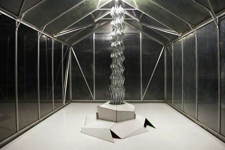 Die Landschaft reagiert in ihrer formalen Struktur auf die Architektur des Gewächshauses, ihrer temporären Behausung und fragilen Schutzhülle. Klimatische Bedingungen sowie der Wechsel der Tageszeiten werden in diesem Microkosmos in irritierender Weise integriert. Wir können uns selbst als Betrachter und Forscher erleben, mit dem widersprüchlichen Wunsch, Formen und Wahrnehmung zu kategorisieren und gleichzeitig intuitiv erleben zu wollen.
